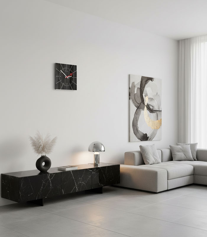 این ساعت شیشه‌ای را می‌توان با آینه‌ها، تابلوهای مدرن و اکسسوری‌های مینیمال ترکیب کرد تا دیوار شما جلوه‌ای لوکس و مدرن پیدا کند.