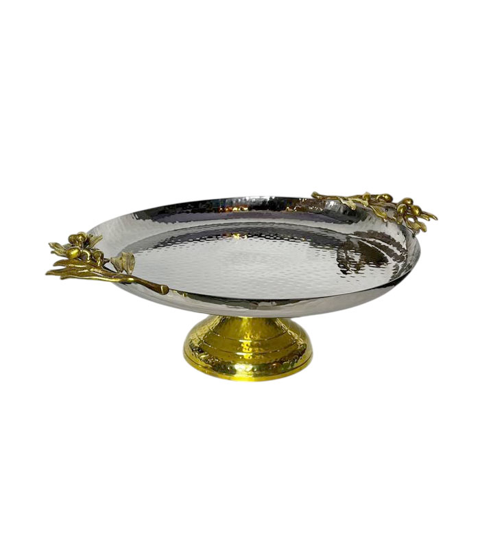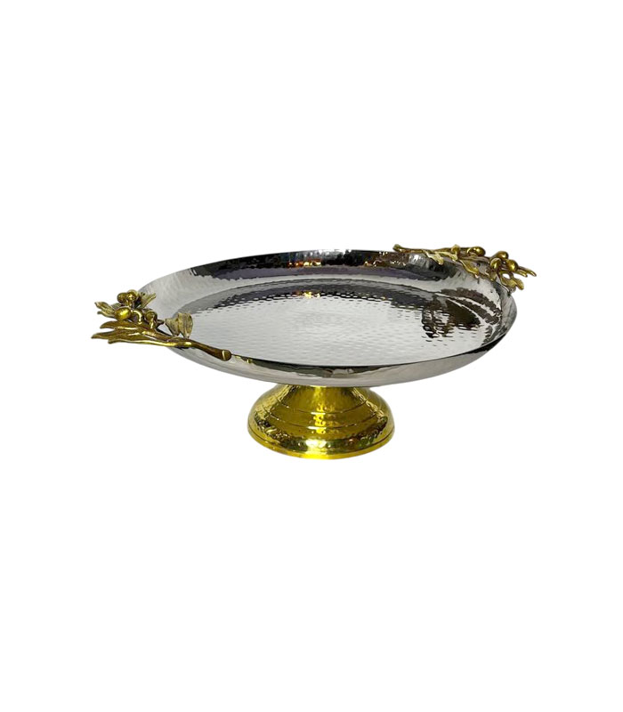 این ظرف سرو زیبا از استیل با کیفیت بالا ساخته شده و سطح آن با تکنیک چکشکاری دستی طراحی شده است که علاوه بر ایجاد بافتی چشمنواز، جلوهای هنری و خاص به محصول میدهد. تزئین ظریف طرح برگ زیتون برنجی در کنار پایه برنجی، ترکیبی از سبک کلاسیک و مدرن را ایجاد کرده و آن را به انتخابی مناسب برای دکوراسیونهای لوکس تبدیل کرده است.
