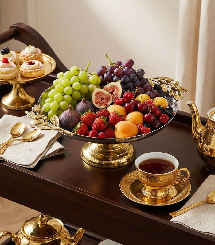 ابعاد استاندارد و طراحی پایهدار باعث میشود این ظرف علاوه بر کاربرد پذیرایی، نقش یک عنصر دکوراتیو شیک را نیز ایفا کند. استفاده از متریال باکیفیت و ساخت دستساز هندی، دوام بالا و جذابیت بصری این محصول را تضمین میکند.